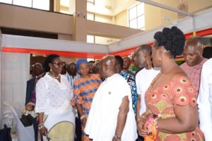 H.E. President Akufo-Addo and Hon. Ursula Owusu (Minister of Communications) in a chart with Ms. Hamdaratu Zakaria, Ag Executive Secretary, Postal and Courier Services Regulatory